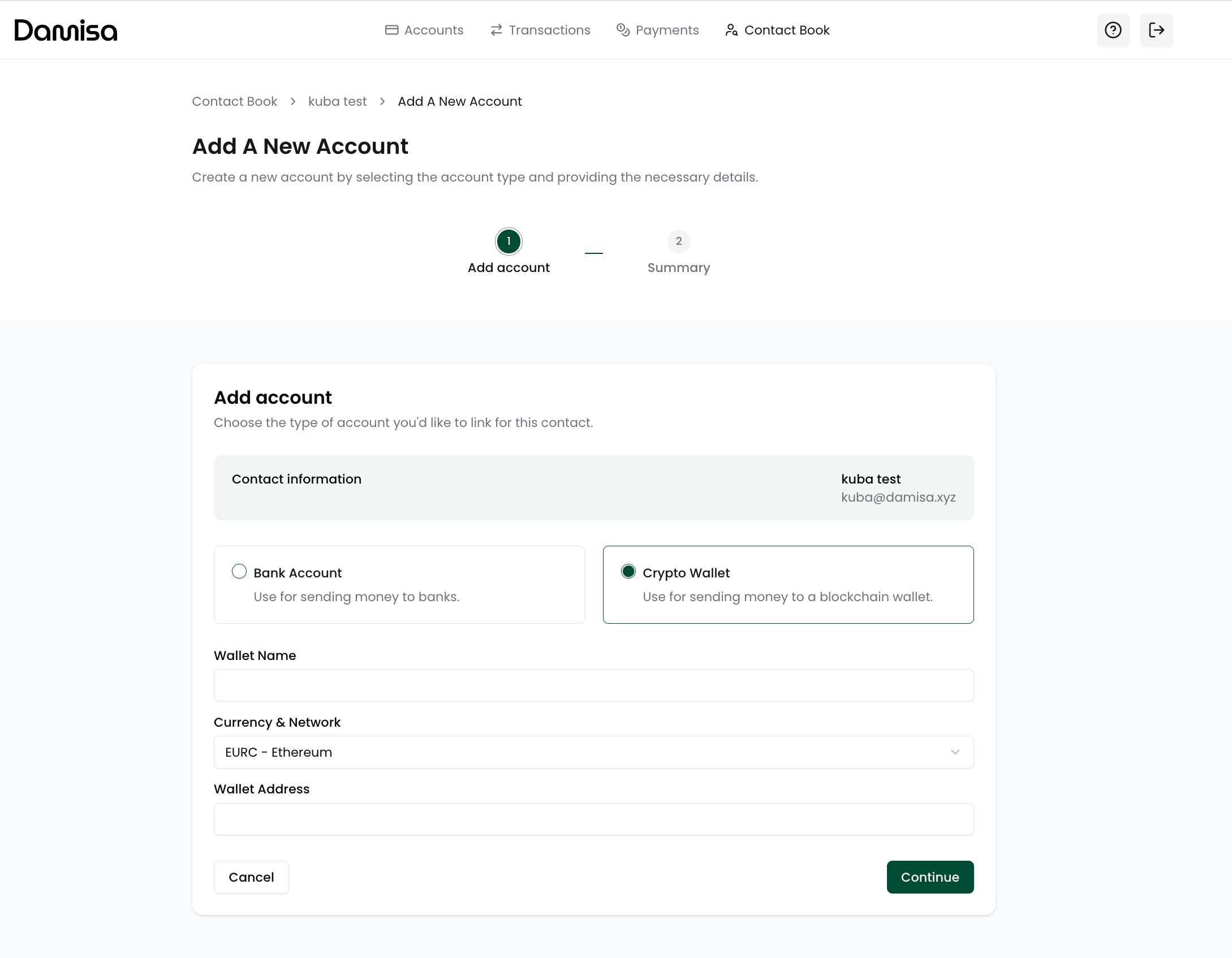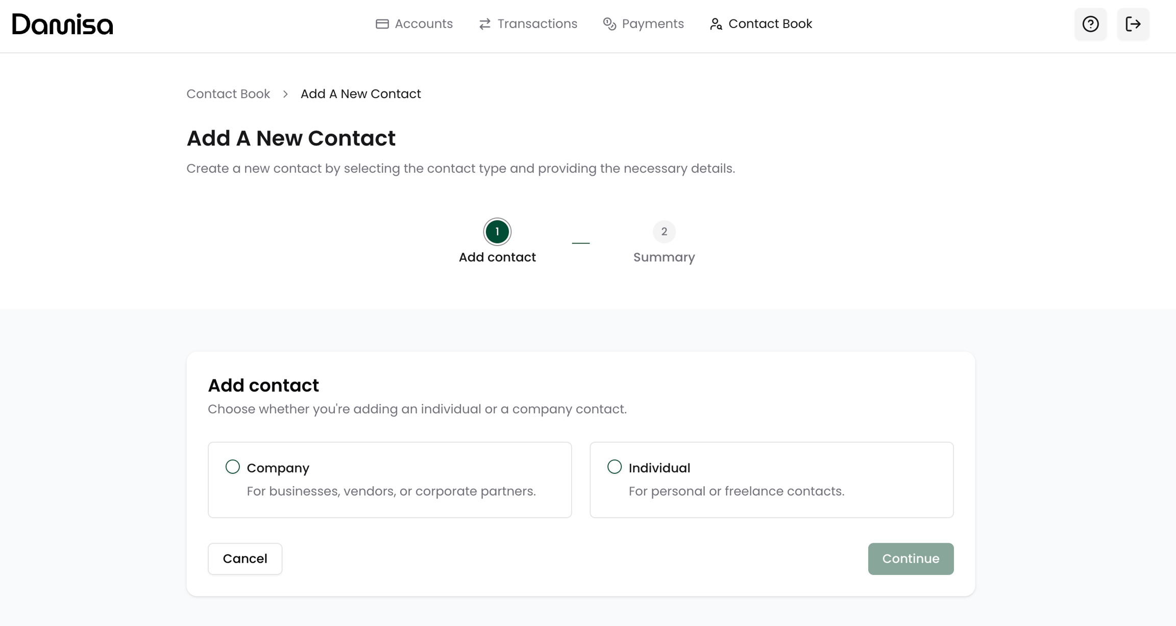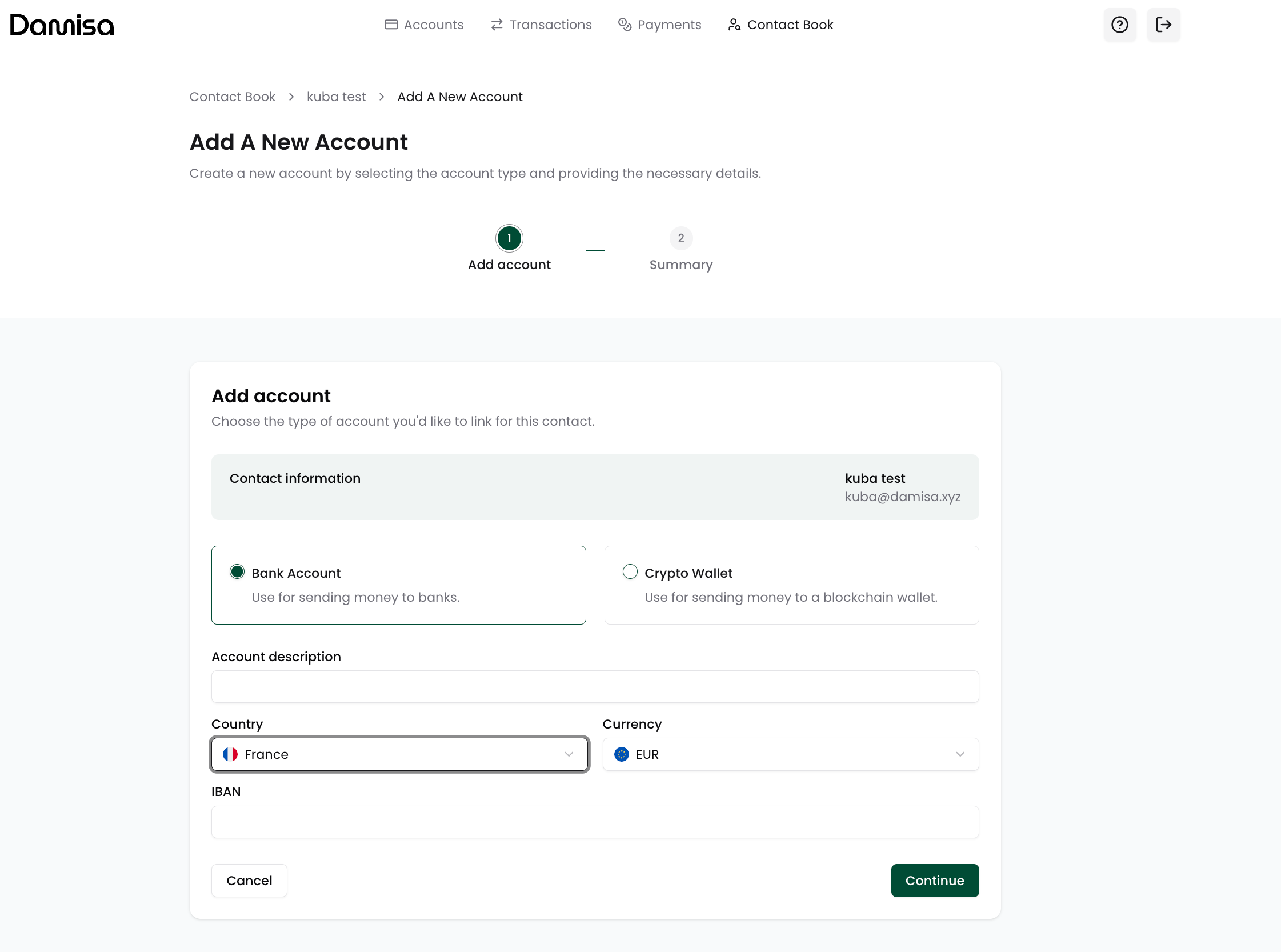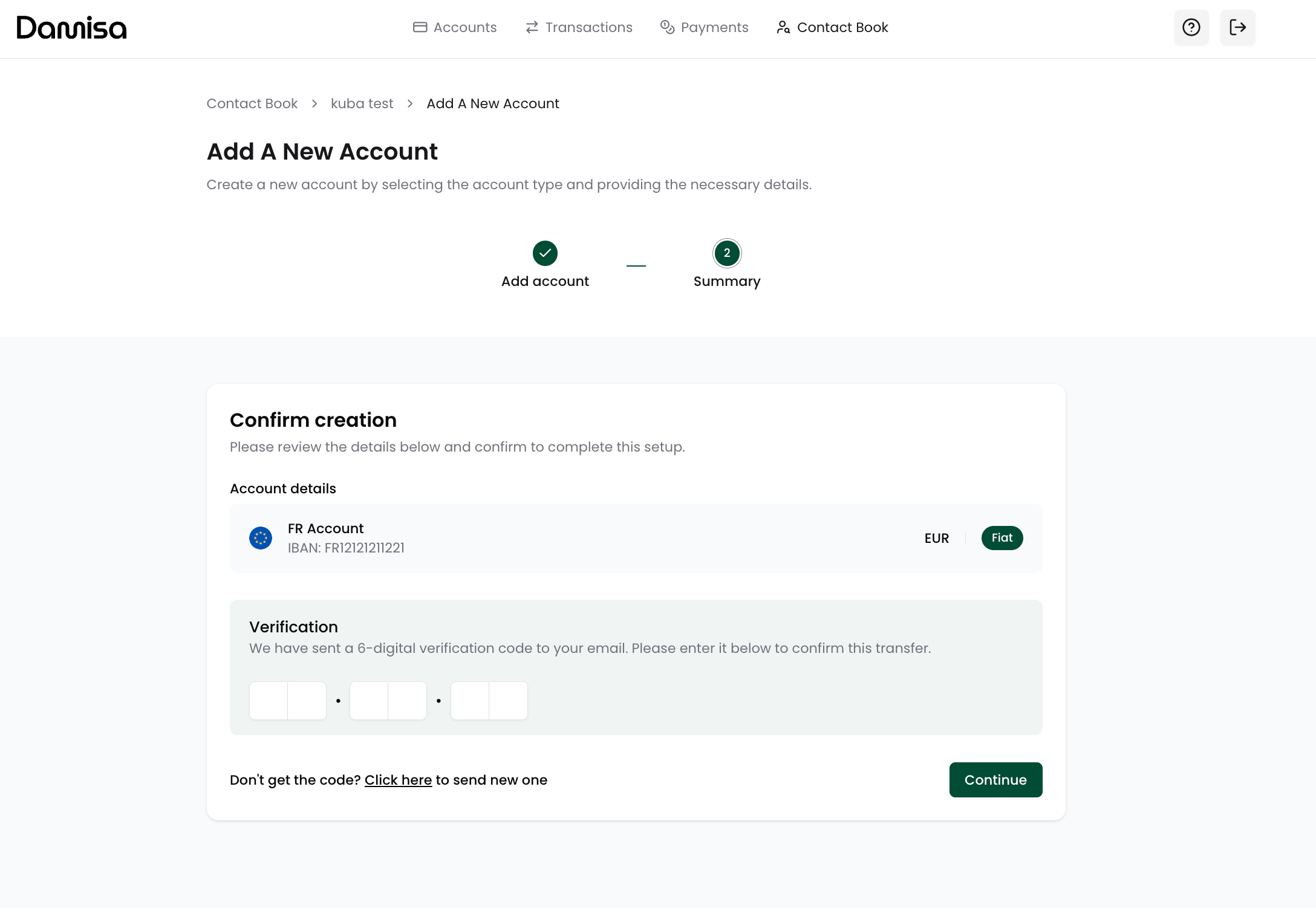 To initiate an outgoing transfer to an external party, it’s not enough to add the contact alone - you must also define at least one account where the funds will be sent. This ensures that Damisa has the correct destination details for executing the transfer, while maintaining compliance and operational traceability.