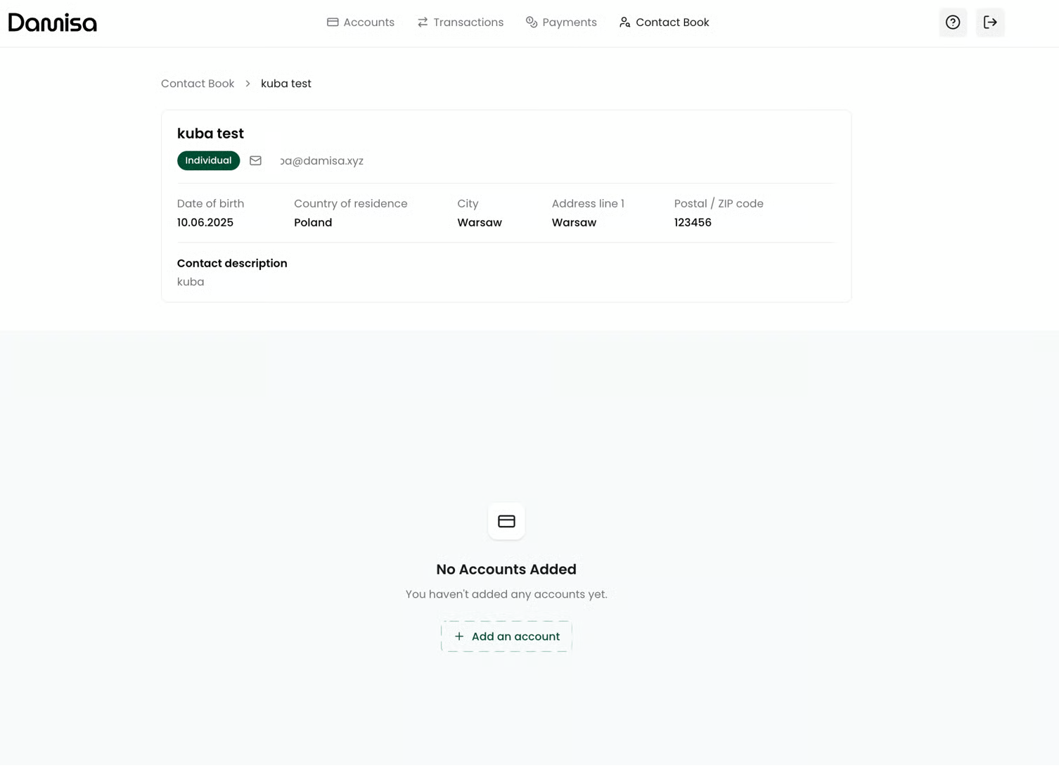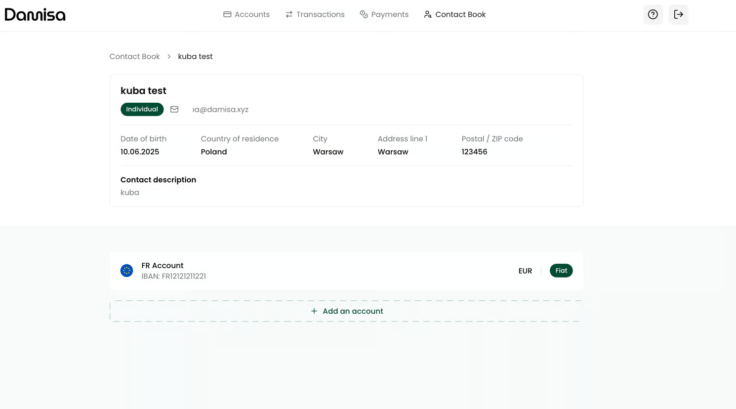To initiate an **outgoing transfer** to an external party, it’s not enough to add the contact alone - you must also define at least one account where the funds will be sent. This ensures that Damisa has the correct destination details for executing the transfer, while maintaining compliance and operational traceability.