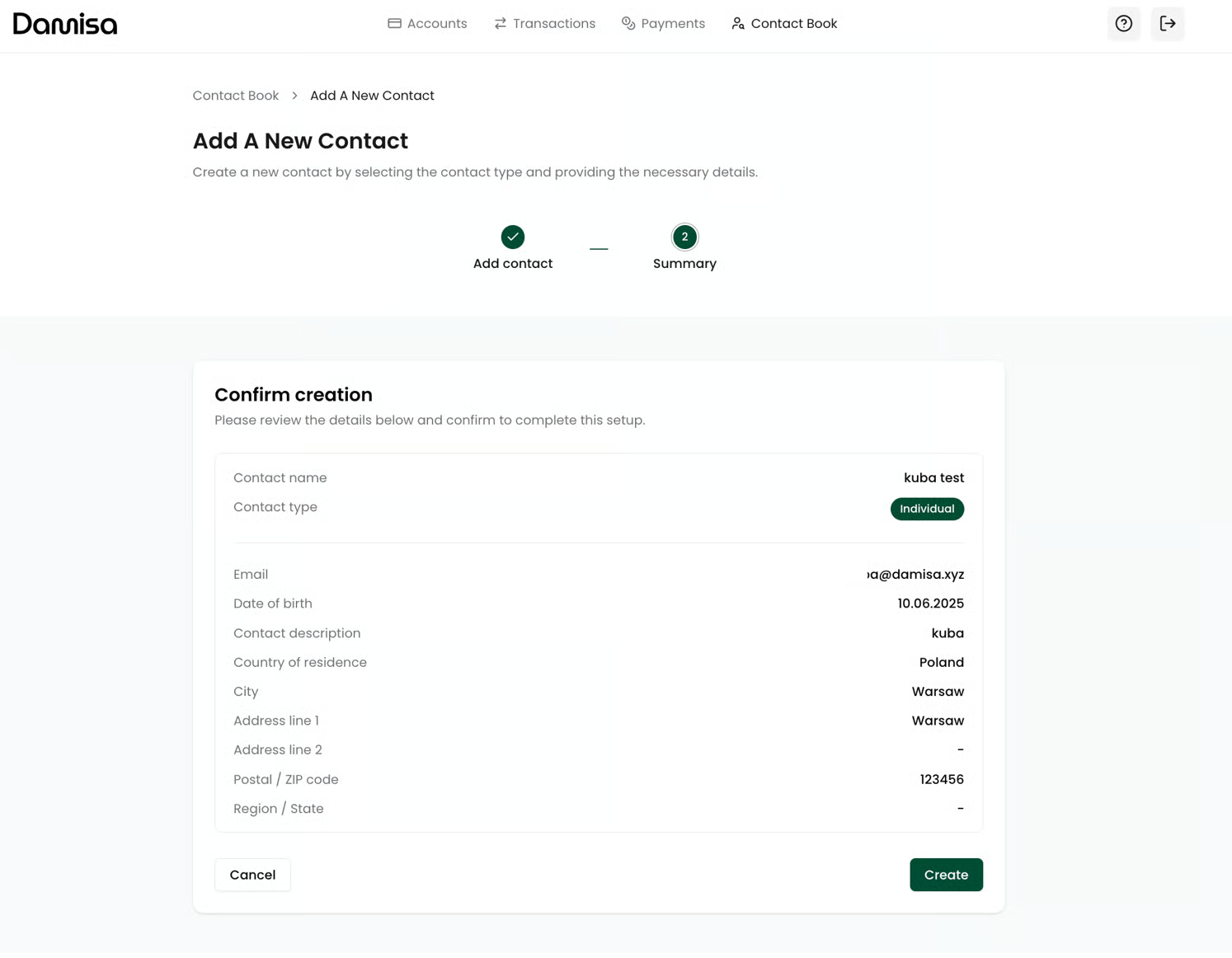 Once the contact is created, it will be saved with a **Pending Verification** status and will be automatically processed through Damisa’s compliance pipeline.