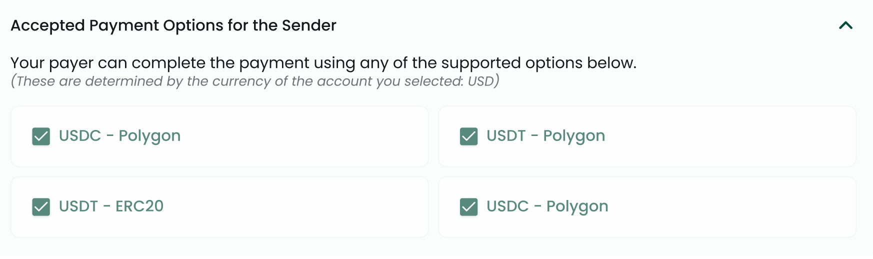 Currently, the list of payment methods (e.g.: supported assets, networks, fiat rails) is determined by your agreement model and the configuration of the markets in which you operate.