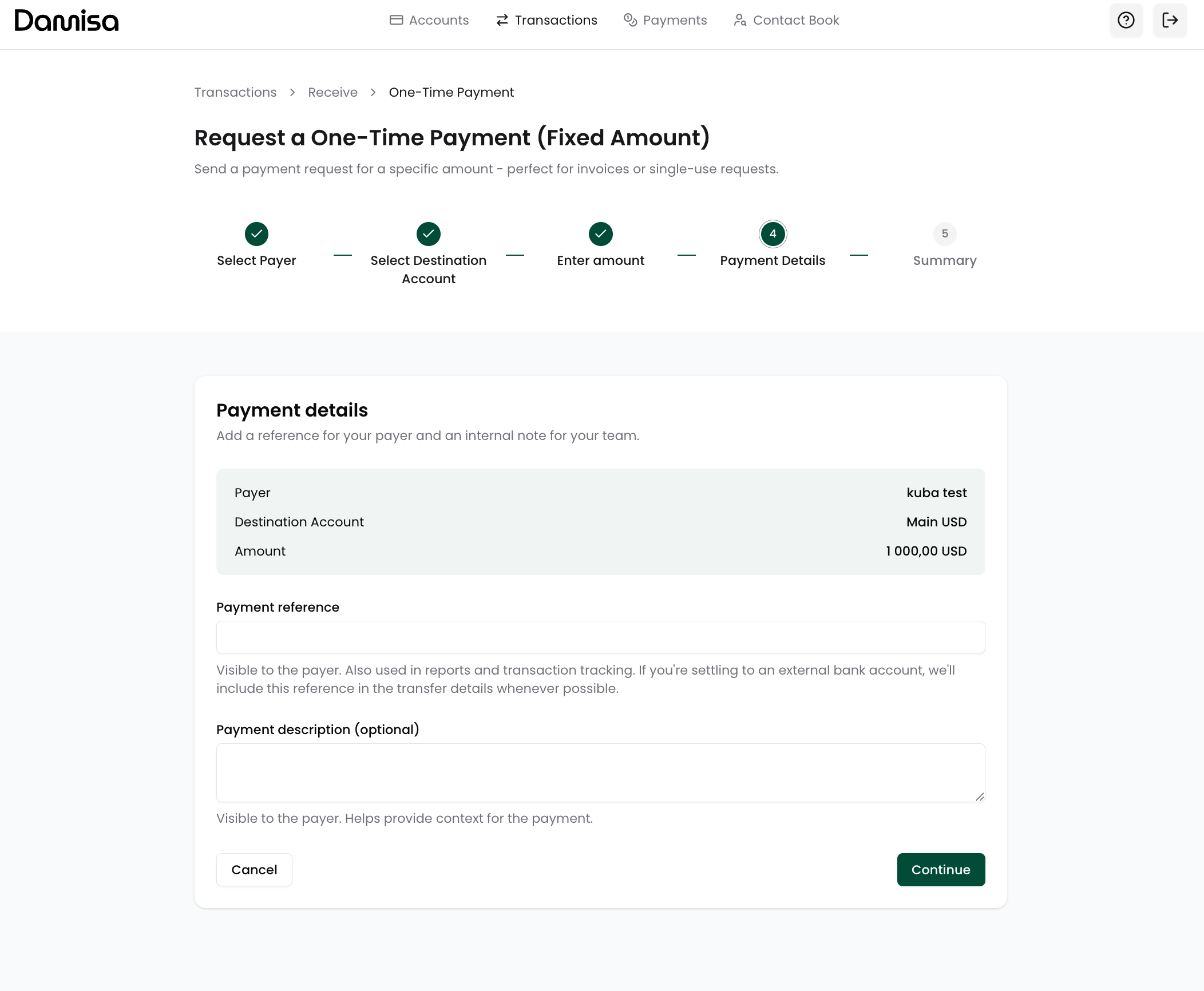 Payment Reference (mandatory) - a reference visible to the payer on the Hosted Payment Page and included in your reports and transaction tracking. Damisa will attempt to pass this reference wherever possible, including in downstream settlements (e.g., if the payer sends USDC and Damisa settles to your EUR account, we will try to include the reference in the bank transfer details).