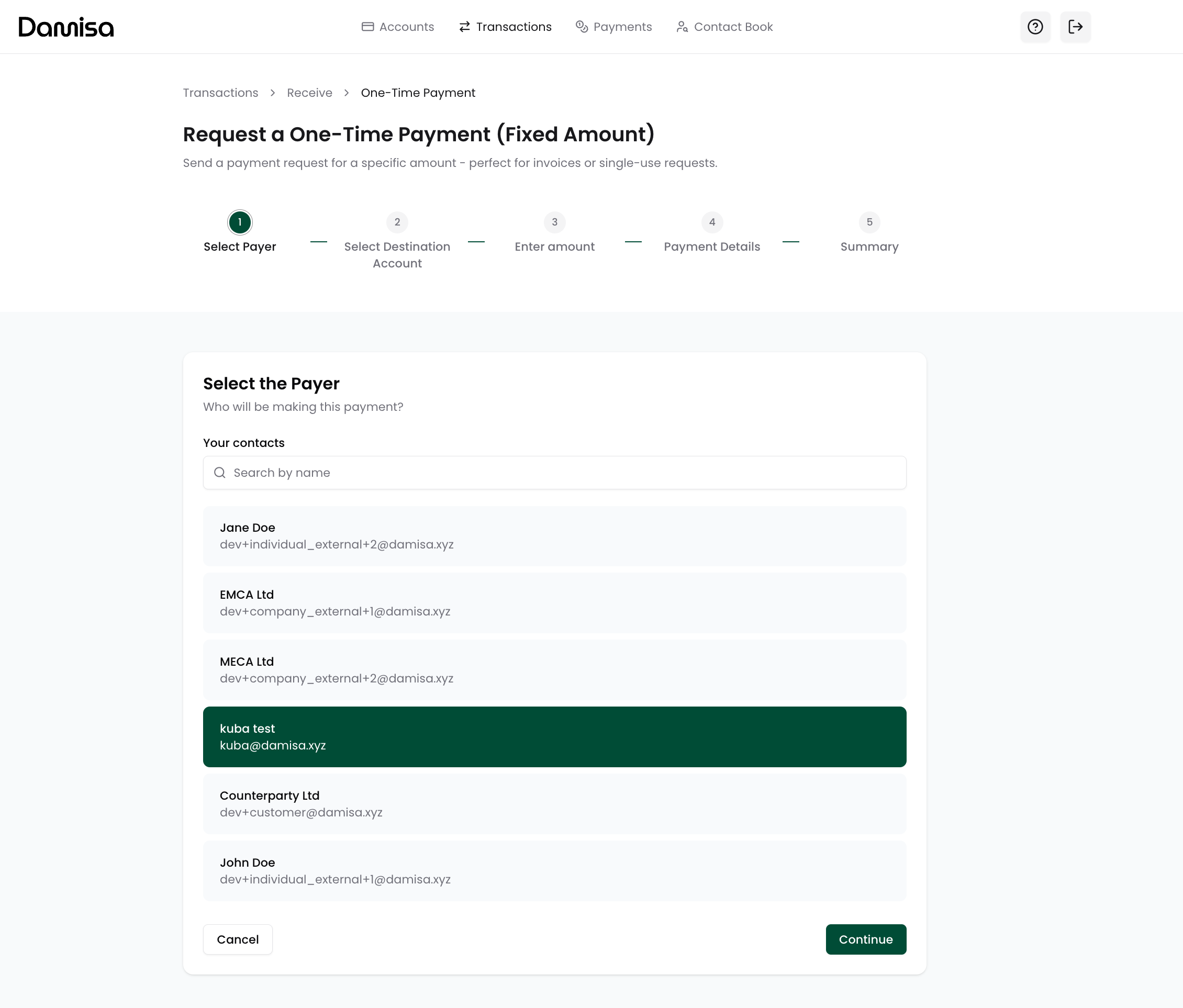 You will see a list of all verified contacts in your Contact Book. Each payment request must be linked to a specific payer to ensure clear reconciliation and compliance.