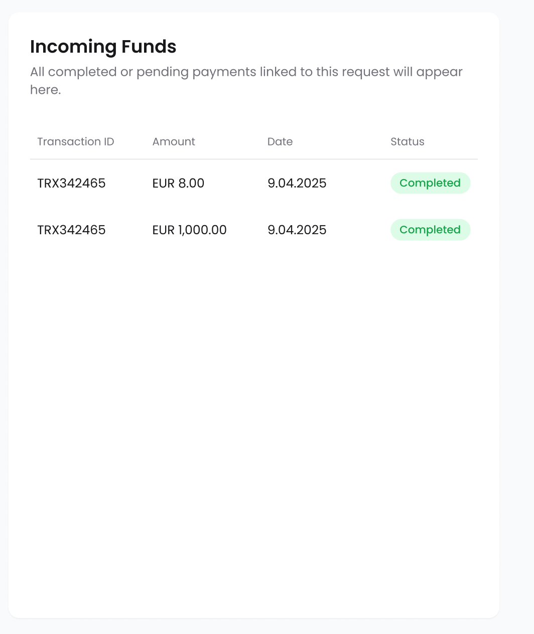If you need to receive funds from a different payer, always create a separate payment request. Using the same request for another party may result in funds being delayed or held for compliance review if the sender’s details do not match the original verified contact.