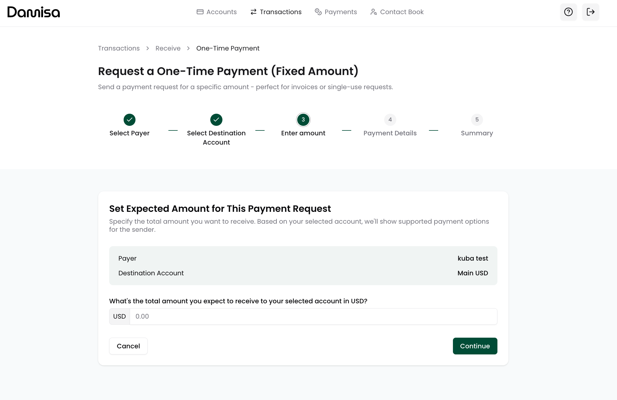 The amount will be denominated in the base currency of the destination Damisa Account you selected in the previous step (e.g., USD or EUR).