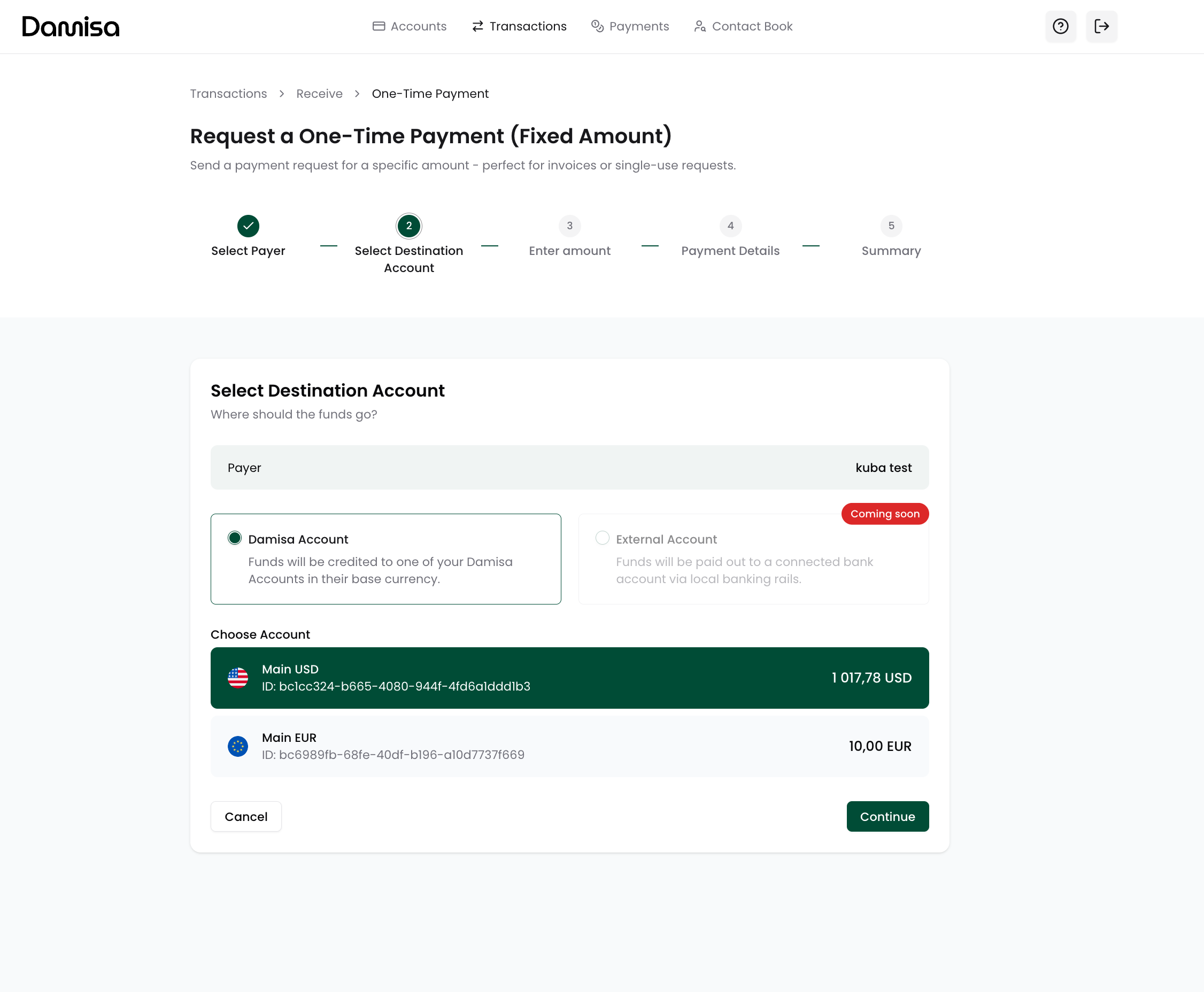 Currently, Damisa supports receiving payments directly into one of your Damisa Accounts, where funds are credited in the account’s base currency (e.g., USD, EUR). From there, you can manage your treasury and settle funds to your external accounts when needed.