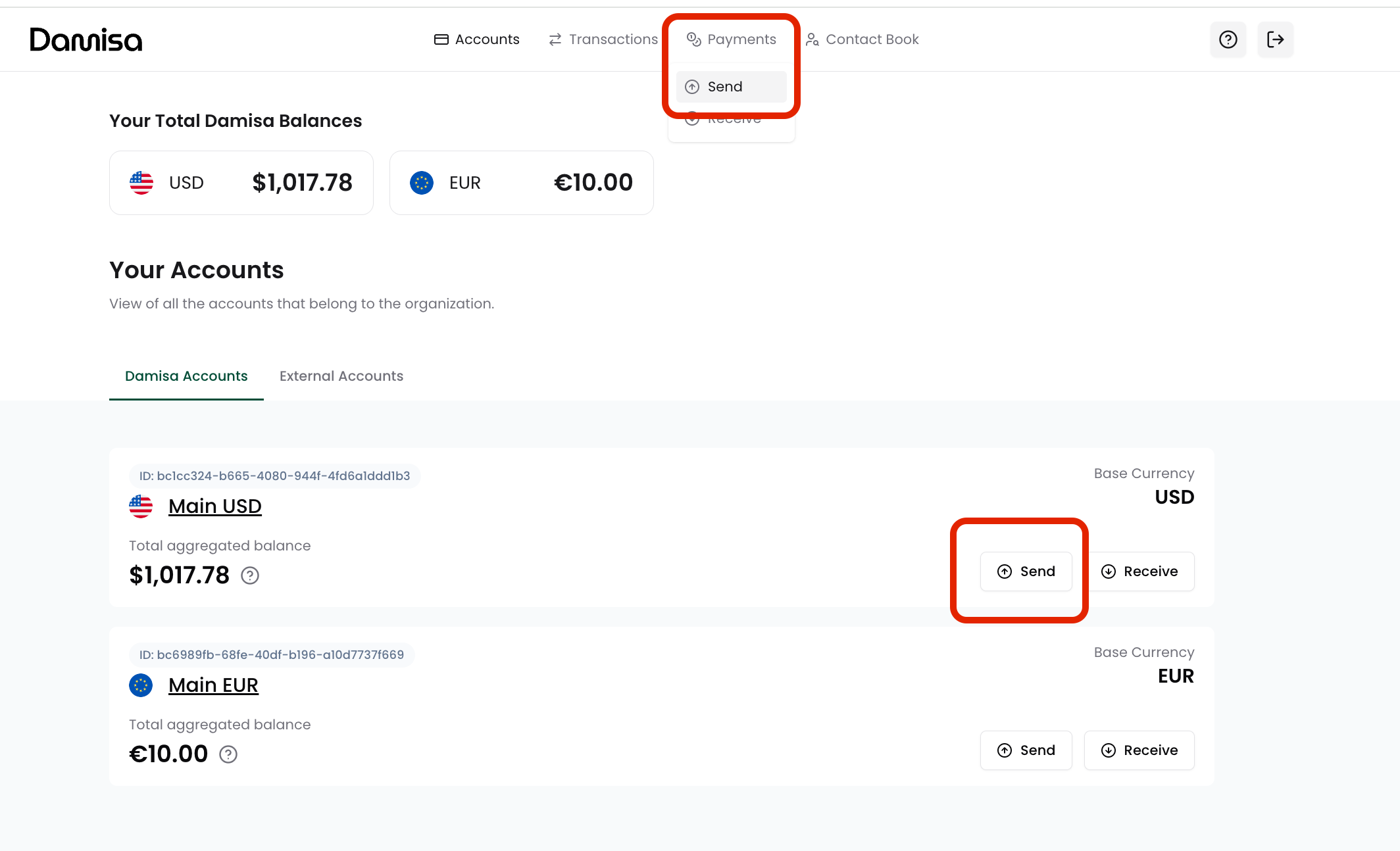 Click on the specific Damisa Account you wish to send funds from.