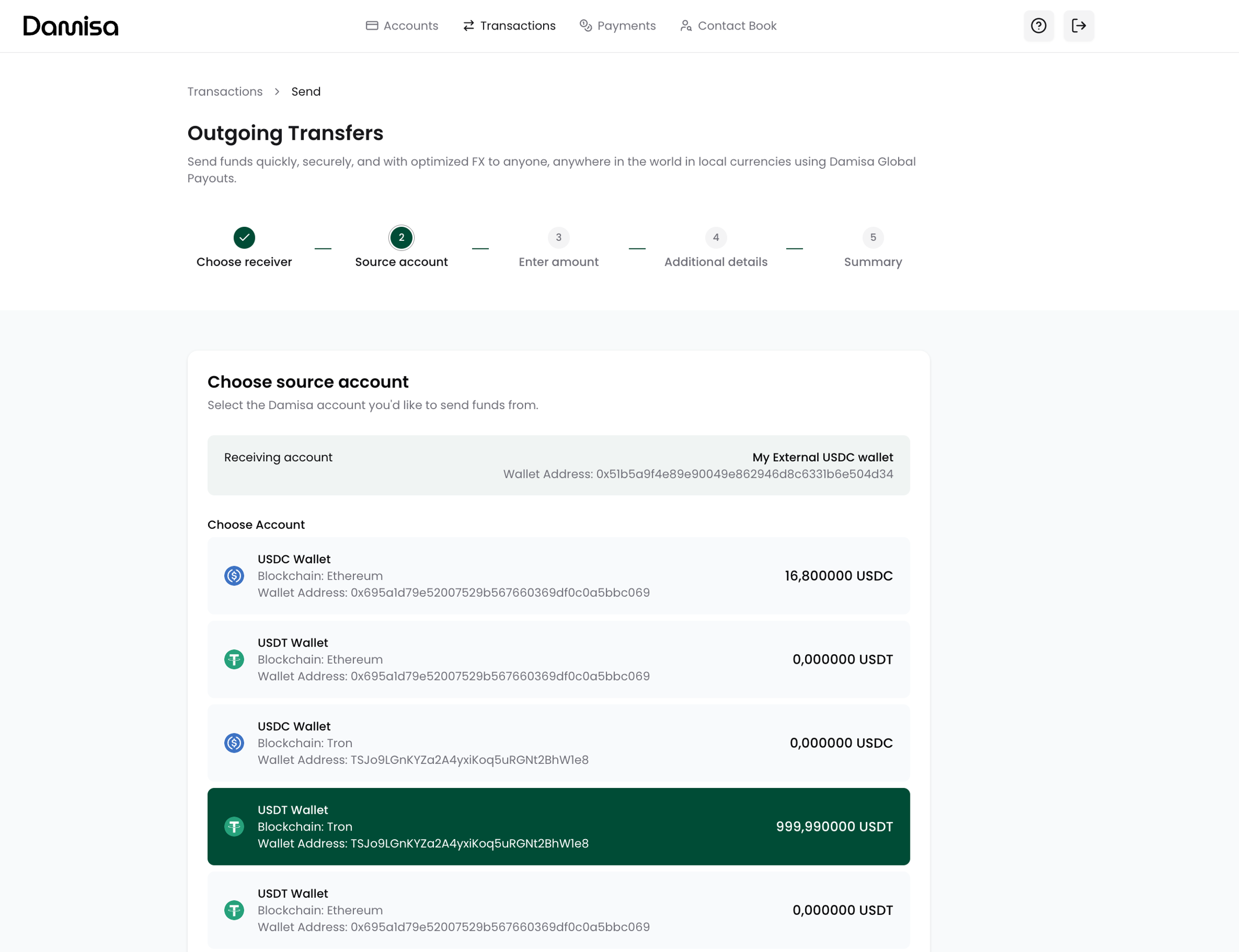 Next, you will choose which Damisa Account to send funds from.