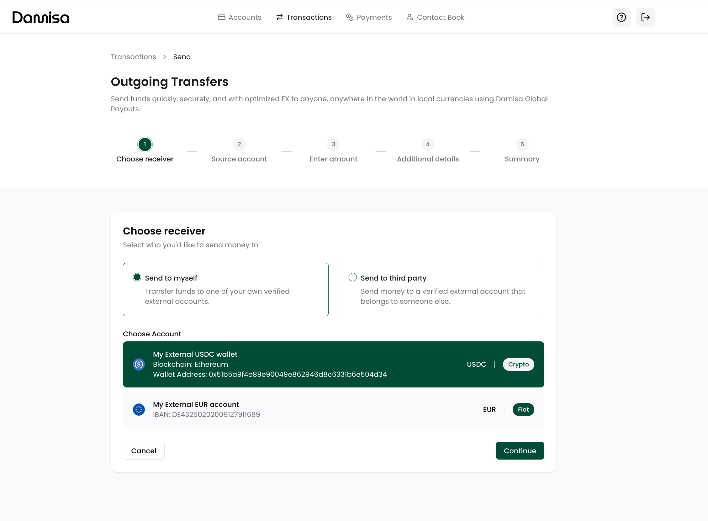 For example, you can send funds from your USDC (USD) wallet to an external EUR account, with Damisa handling FX conversion at the moment of transfer.